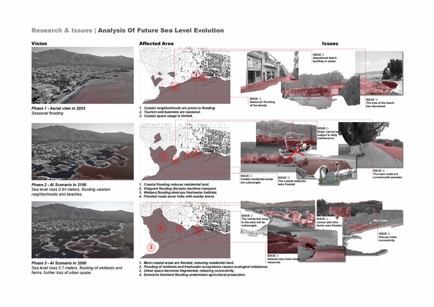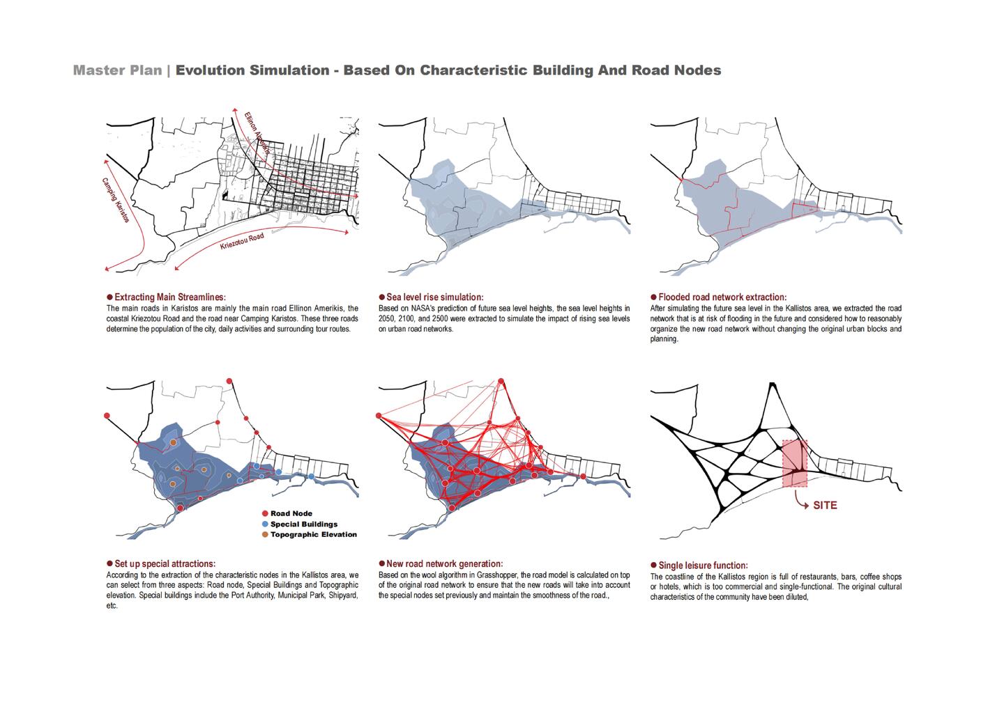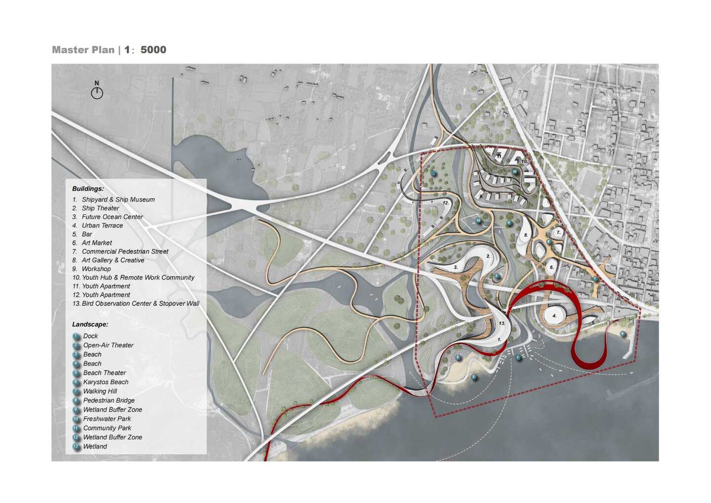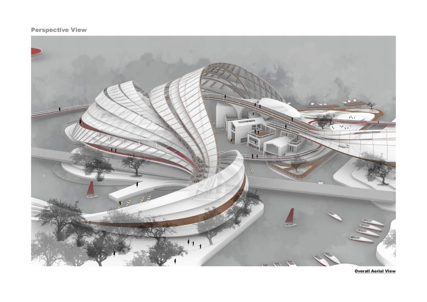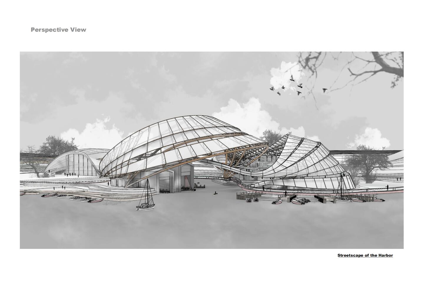 A system of multi-layered ramps organizes vertical connections, guiding movement like fluid vortices while offering progressive public experiences—from coastal plaza to exhibition halls, shipyard ruins, and viewing platforms. These ramps also serve as resilient infrastructure, acting as embankments during sea-level rise and as open promenades in normal conditions.