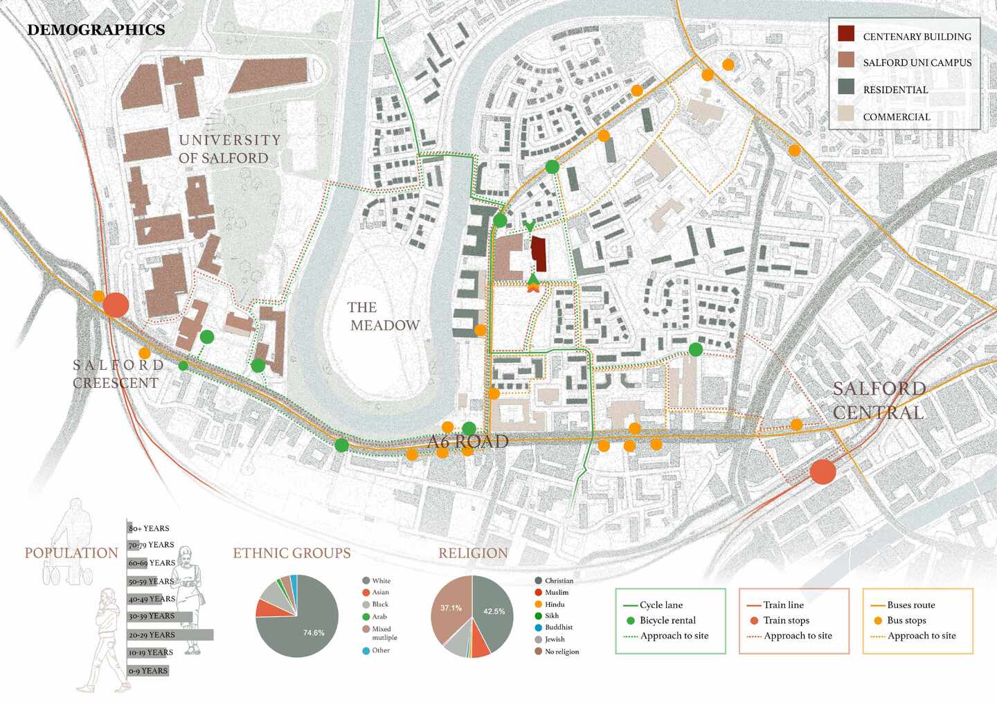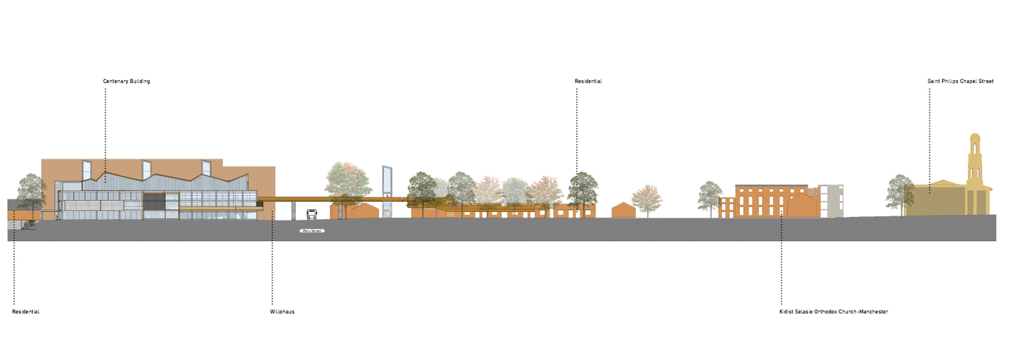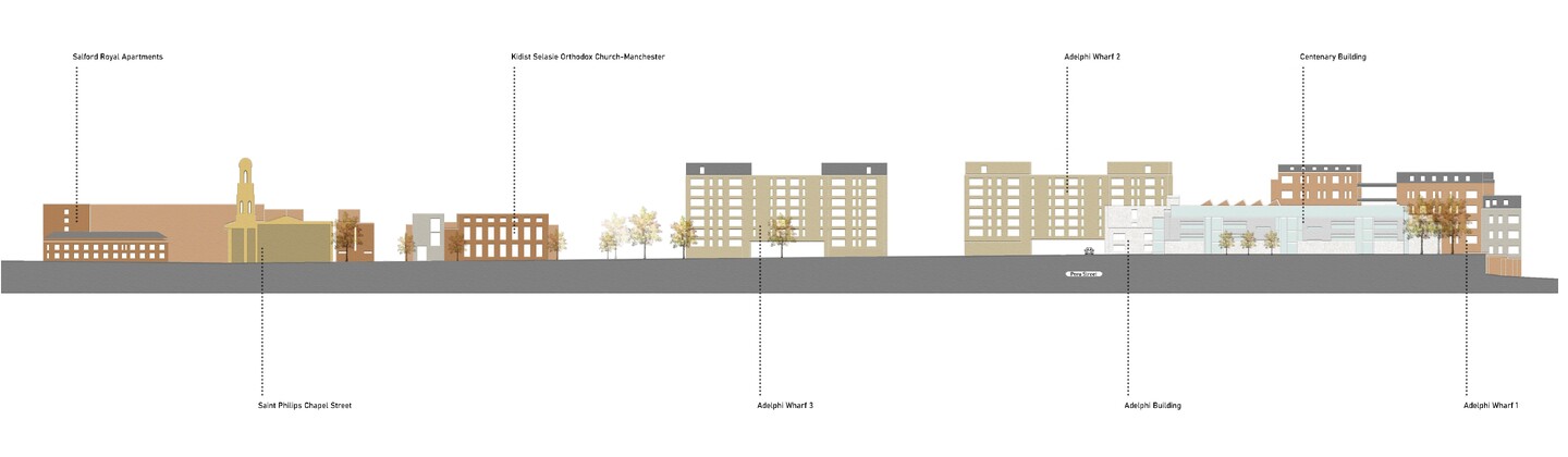 In this project, we elevated Centenary Building’s cores above the roofline to form towers. And a new tower is introduced between the Centenary Building and the Church, thereby creating a rhythmic and visual connection that integrates the old and new structures into a cohesive whole. Moreover, we created a bridge that linking the building directly to the adjacent park, to enhance the building's connection with surroundings. The park will be transformed with lush greenery, various outdoor activity areas, and walking paths. In addition, we demolished part of the Adelphi Building to open a gap, establishing an intuitive line of sight to the river and strengthening the interaction with the natural landscape. Concurrently, we designed terraced landscapes on the foundation to bridge the 3.2-meter height difference with the lower site, providing convenient accessibility for the residents of the nearby lower residential buildings.