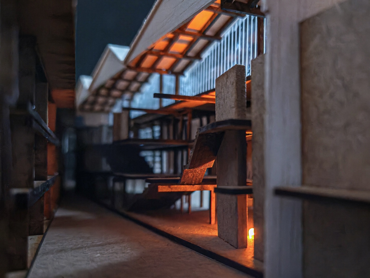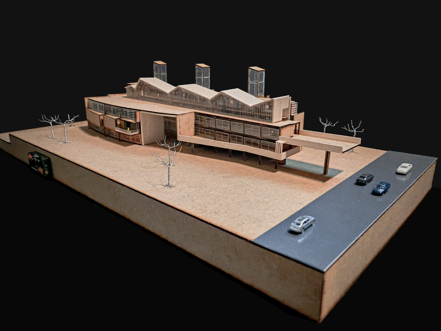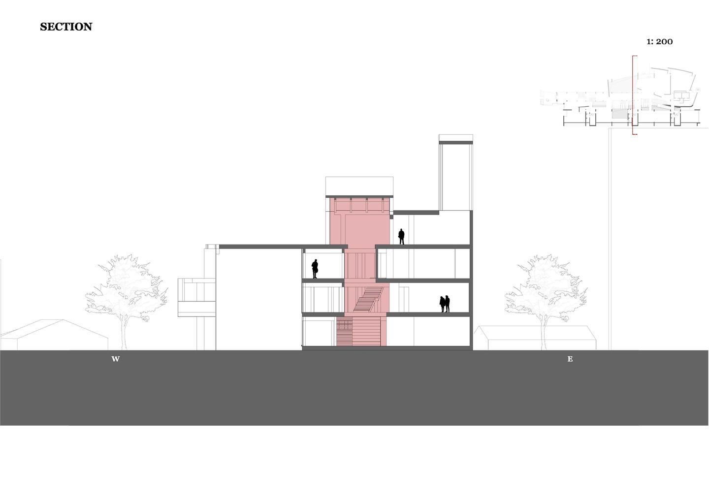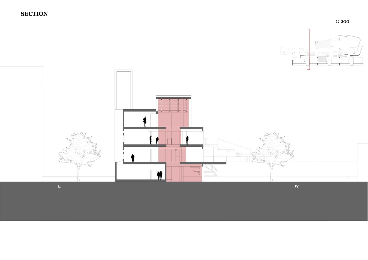Concerning the design of the roof portion, we raised the roof in order to create more public space on the third floor and to improve the lighting of the atrium. The height of the roof is to be the level with the third-floor roof, which is unified the overall structure, and enhanced the sense of openness in the upper levels. At the same time, the shape of the voids in floors is extended to the corresponding position on the roof.It is ensuring spatial continuity between different levels. To further highlight these voids, sloped roofs were added as architectural features, which will guiding natural light deeper into the interior. These sloped roofs are going to carefully connected to form a continuous slope that covers the original roof, creating a coherent architectural gesture that integrates functionality with a distinctive spatial character.